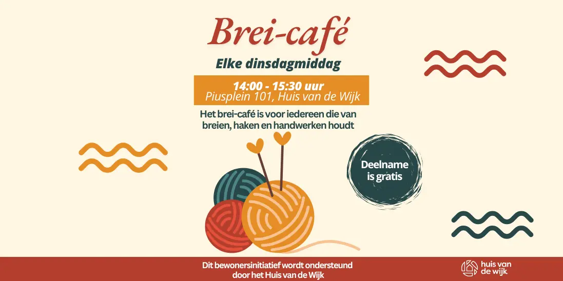 Elke dinsdagmiddag van 14:00-15:30 uur is het brei-café in het Huis van de Wijk. Het brei-café vindt je bij de leestafel. Gezellig samen breien of haken met een kopje koffie of thee. Het brei-café is voor iedereen die van handwerken houdt.