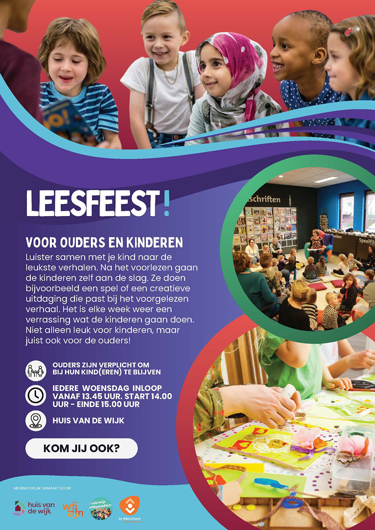 Elke woensdagmiddag van 14.00u tot 15.00u (inloop vanaf 13.45u) barst het Leesfeest los in het Huis van de Wijk! Dit is voor kinderen en ouders.