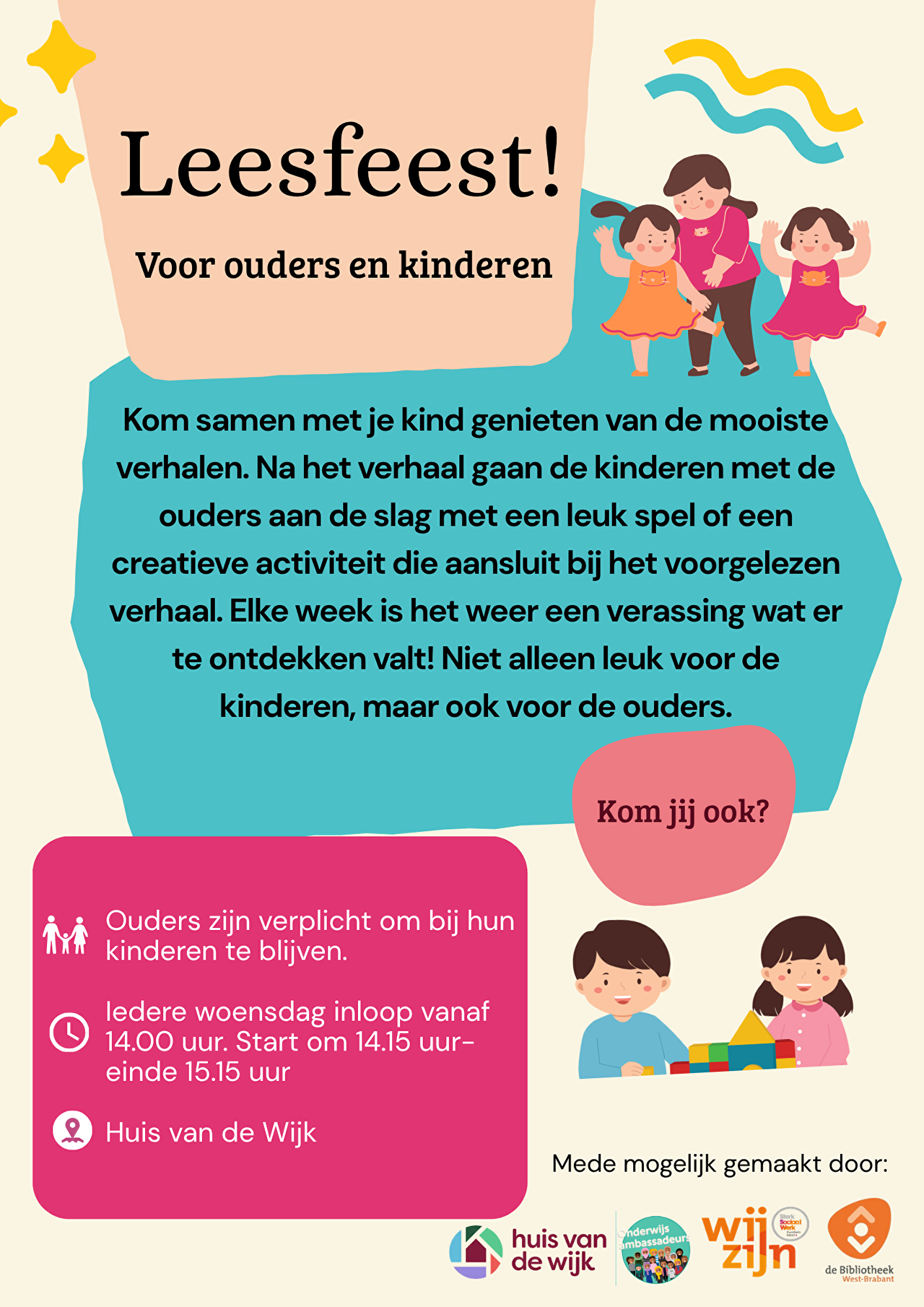 Elke woensdagmiddag van 14.15u tot 15.15u (inloop vanaf 14.00u) barst het Leesfeest los in het Huis van de Wijk! Dit is voor kinderen en ouders.